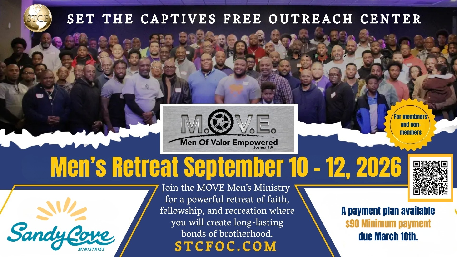 CALLING ALL MEN! – We are excited to announce that the M.O.V.E. Men’s Ministry Retreat will be held from Thursday, September 10 through Saturday, September 12, 2026 at Sandy Cove Ministries retreat center in North East, Maryland. Open to STCF members and men from the community, Sandy Cove Ministries retreat center in North East, Maryland. and it will offer several workshop sessions, led by experts, in the areas of Emotional, Mental, and Financial Health.