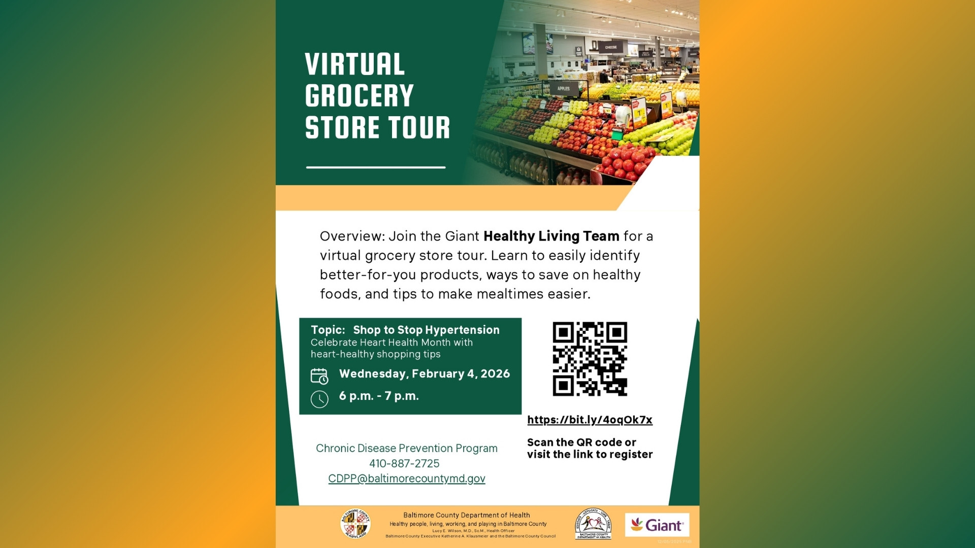 In recognition of the national Heart Health month (February), the Baltimore County Department of Health and Giant Food are hosting a FREE […] |